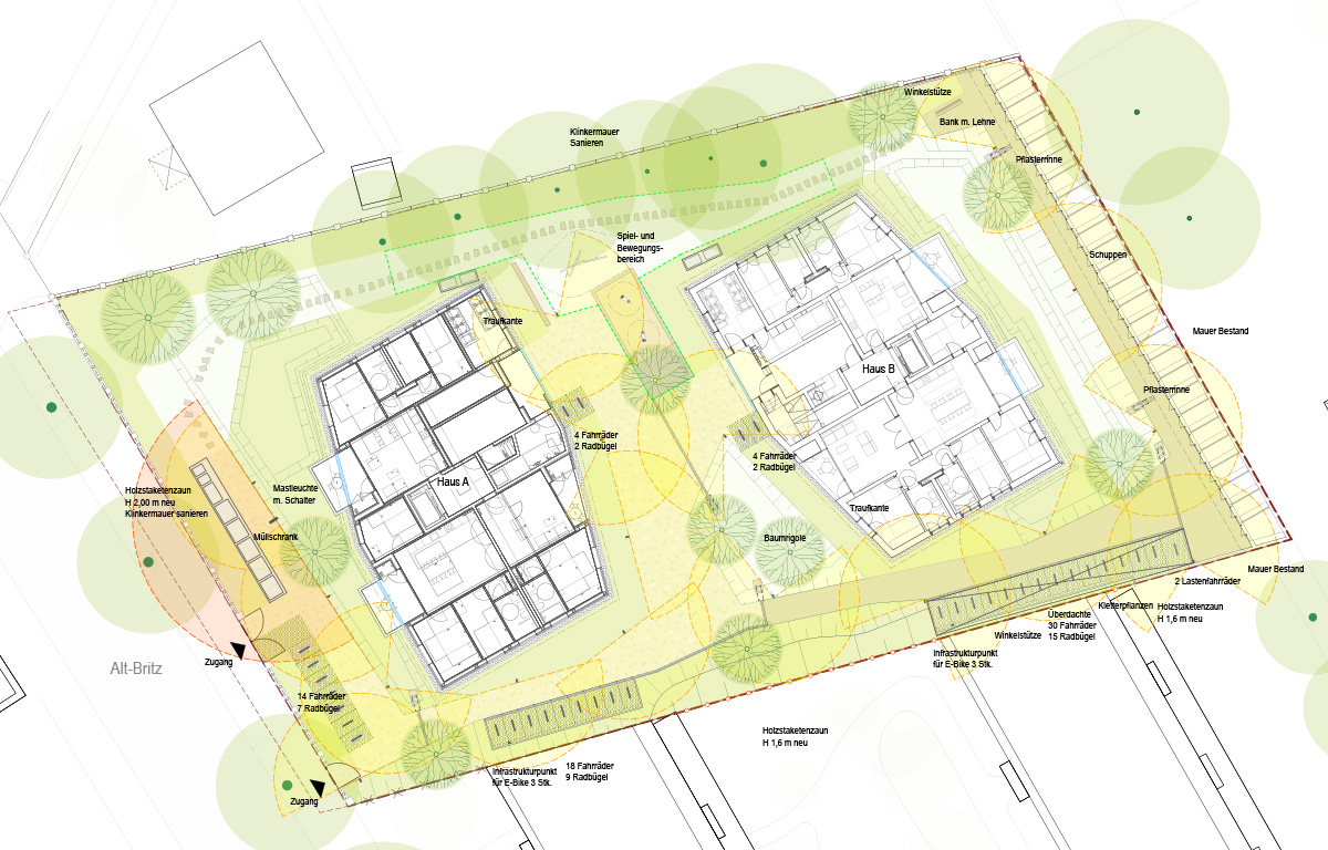 Die Haupterschließung erfolgt über ein neues Zugangstor an der Straße Alt-Britz. Trittplatten führen als umlaufender Rundweg durch das Grundstück. Dezentrale Fahrradstellplätze, darunter zwei überdachte für Sonderräder, sind nah an den Eingängen positioniert. Insgesamt stehen 70 Stellplätze zur Verfügung.