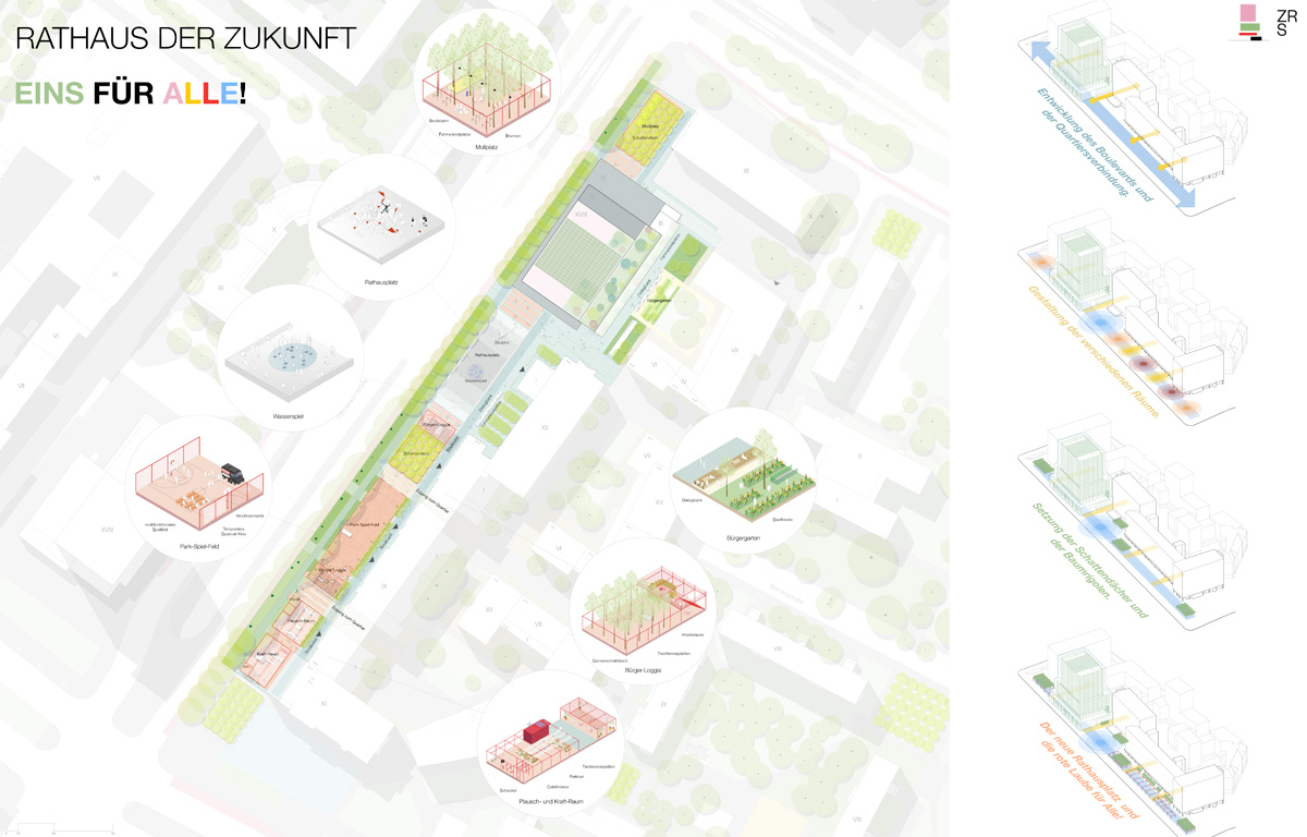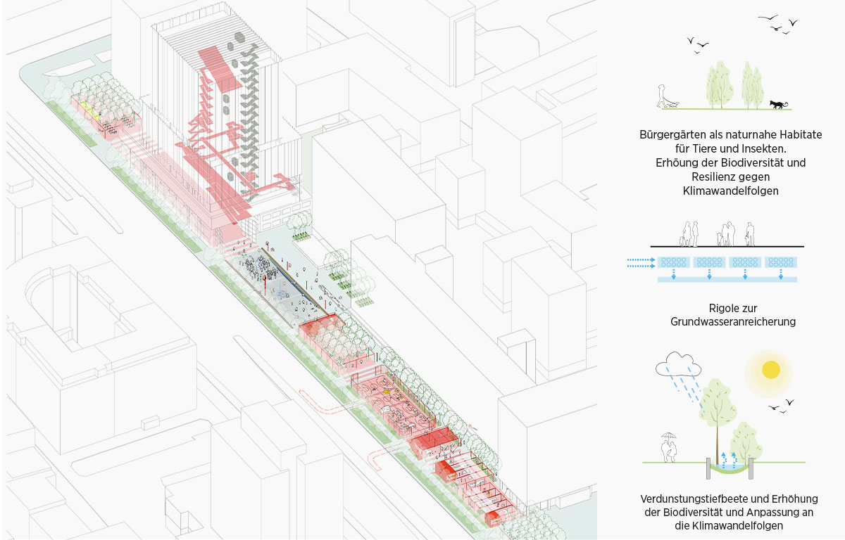 Den Freiraum verstehen wir als Kontinuum parallel zur Otto-Braun-Straße. Es formen sich multicodierte Orte für Kommunikation, Austausch und Versammlung aber auch Entspannung und Spaß.