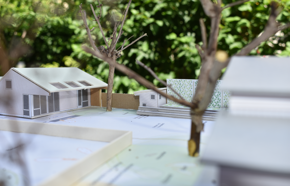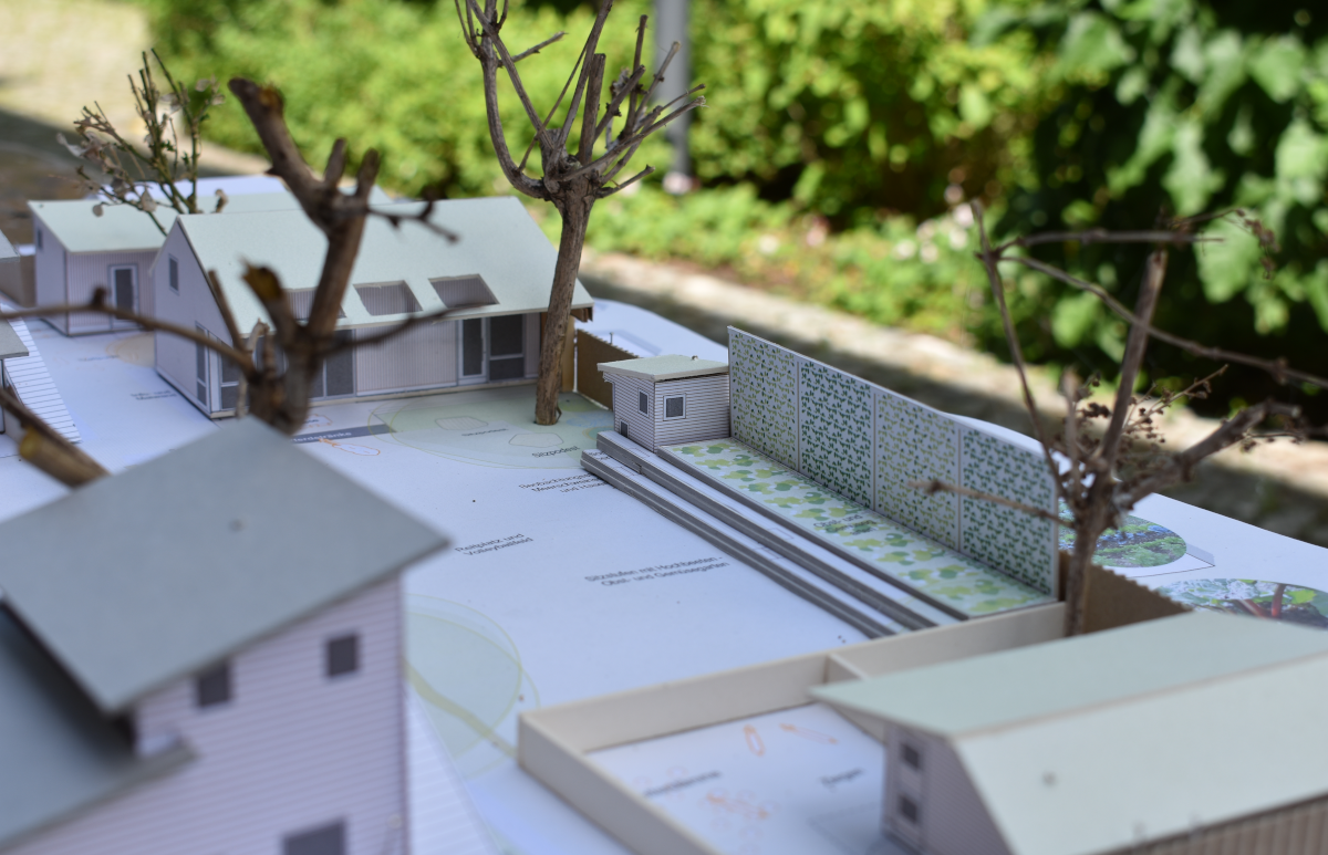 Das Gelände des Kinderbunten Bauernhofs wird mit der neuen baulichen Setzung wie ein traditioneller Bauernhof weiterentwickelt. Der Neubau ergänzt das Ensemble zu einem Vierseithof. So entsteht eine klassische dreifache Gliederung in Tor und Zufahrt, Hof mit Wohn- und Stallgebäuden und rückwärtigen Gärten, Koppeln und Feldern.