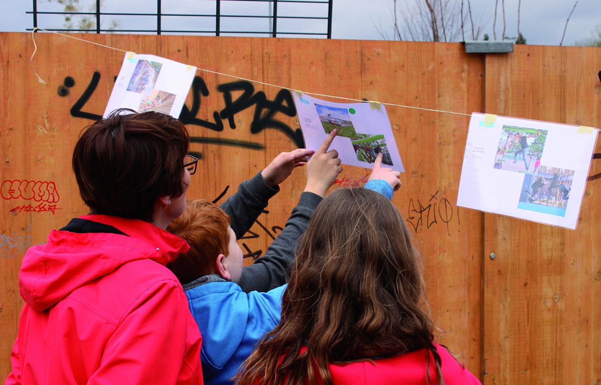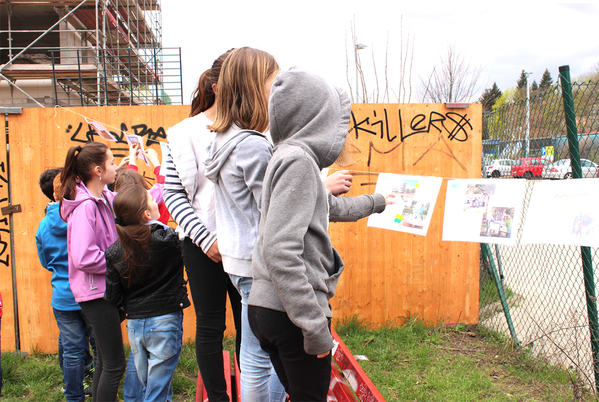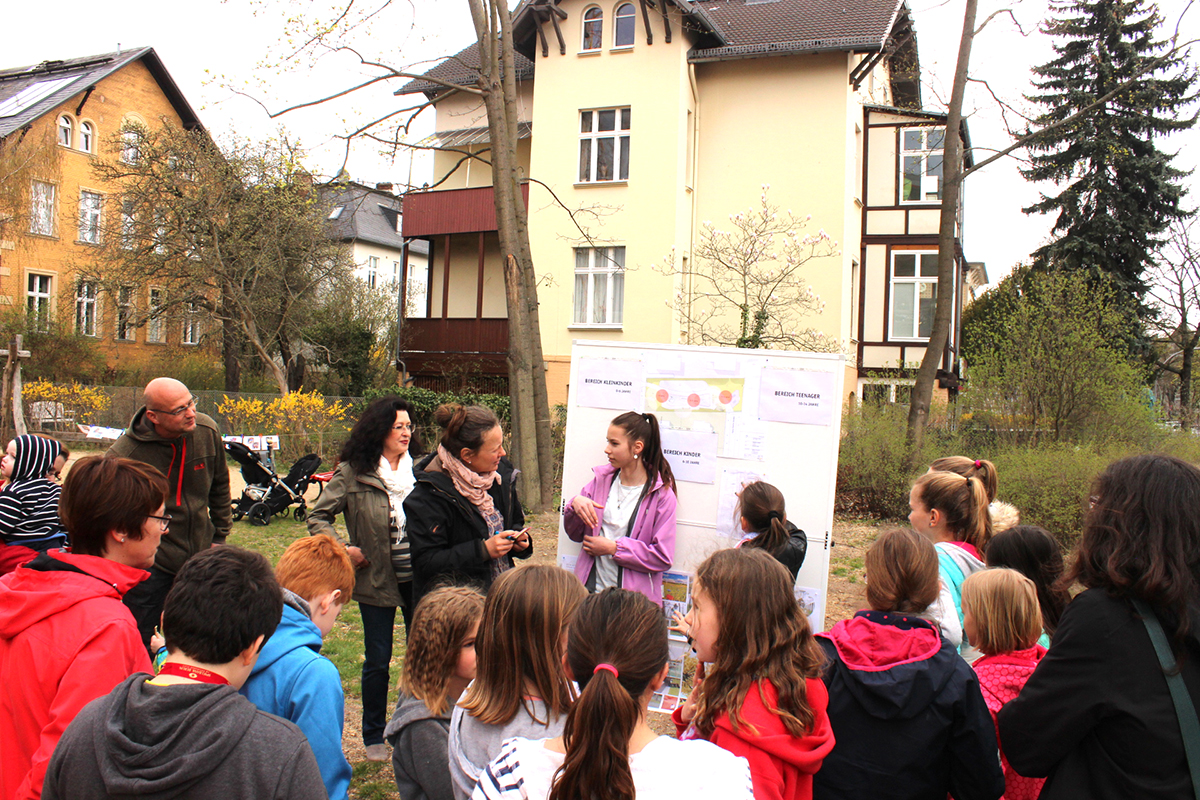 In einer ersten Phase des Partizipationsverfahrens konnten durch eine Plakataktion Anwohner, Kinder sowie die Garten-AG der benachbarten Grundschule mobilisiert und für die Mitgestaltung des künftigen Spielplatzes gewonnen werden.