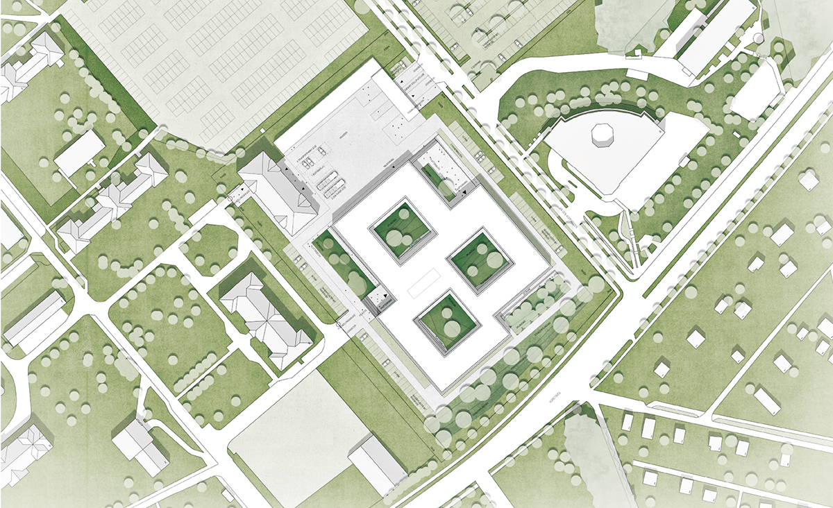 Der Freiraumgestaltung kommt bei Behördenbauten eine wichtige Rolle zu: Für die Zufriedenheit am Arbeitsplatz sind Grünflächen zum Aufenthalt und als Blickpunkt wichtig. Besuchern und Passanten gegenüber gilt es, eine sowohl repräsentative als auch angenehme Atmosphäre zu vermitteln.