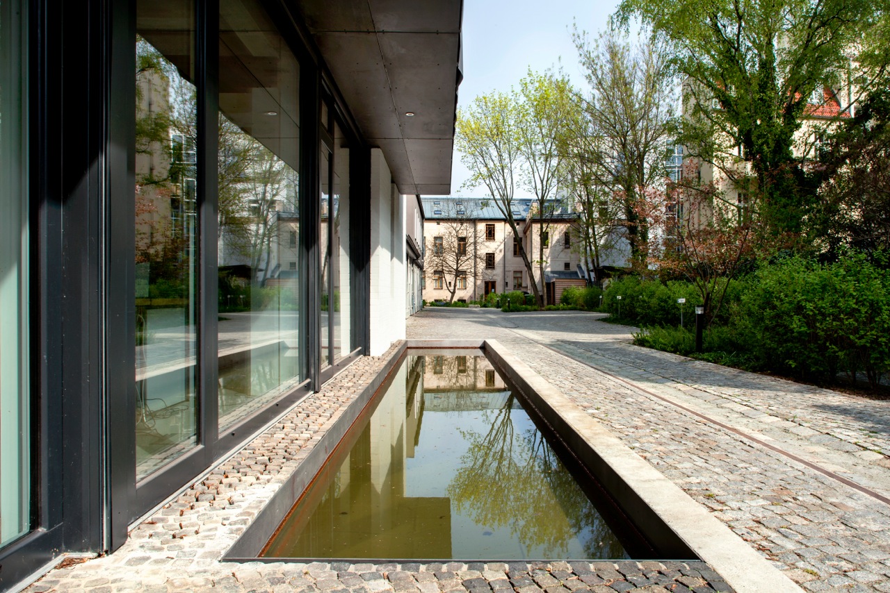 Ein weiteres Highlight der Neugestaltung ist das neu angelegte Wasserbecken vor der Fensterfront der Remise. Bepflanzt mit Schilf und anderen Was- serpflanzen schafft es einen natürlichen und beru- higenden Akzent, der dem gesamten Hof eine be- sondere Atmosphäre verleiht. Das Wasserbecken fungiert nicht nur als visuelles Zentrum, sondern auch als ökologisches Element, welches zur Förde- rung der Biodiversität beiträgt. Zudem wurde eine sichtgeschützte Sitzecke errich- tet, die den Bewohnern und Besuchern des Hofes einen abgeschirmten und gemütlichen Rückzugs- ort bietet. Diese Sitzecke fügt sich nahtlos in das Gesamtbild ein und bietet einen Ort der Entspan- nung und Ruhe.