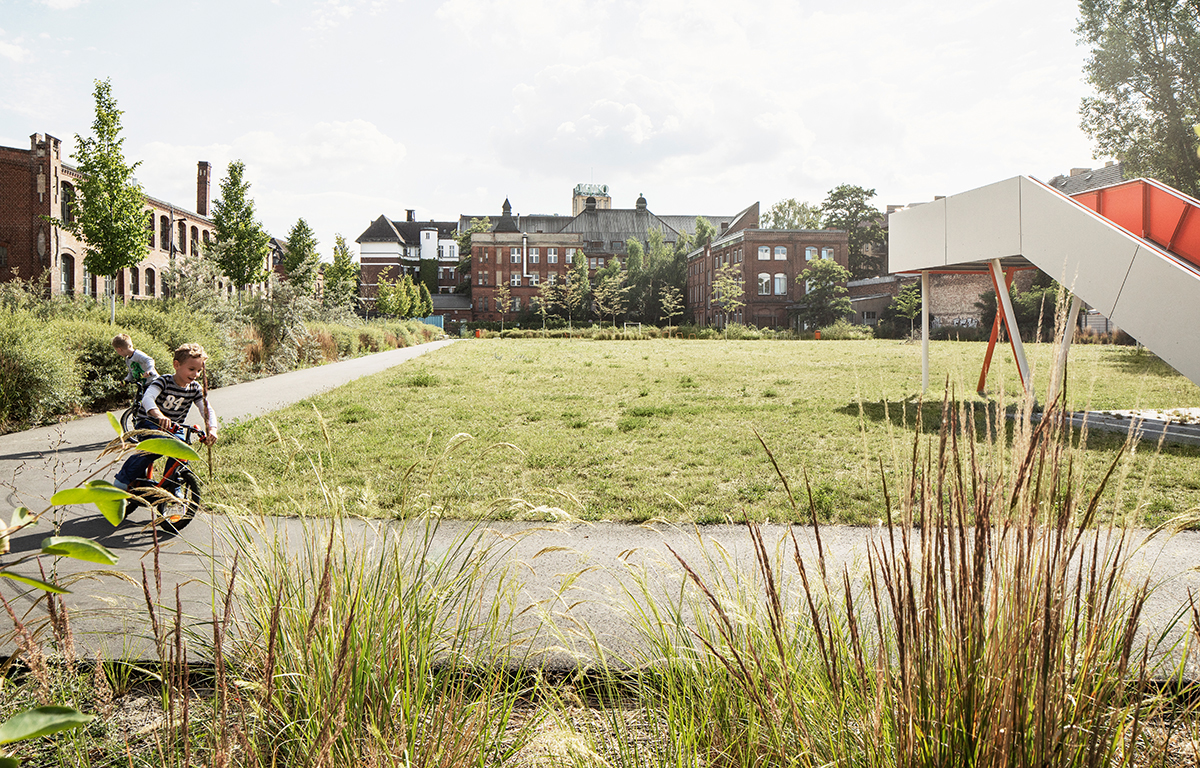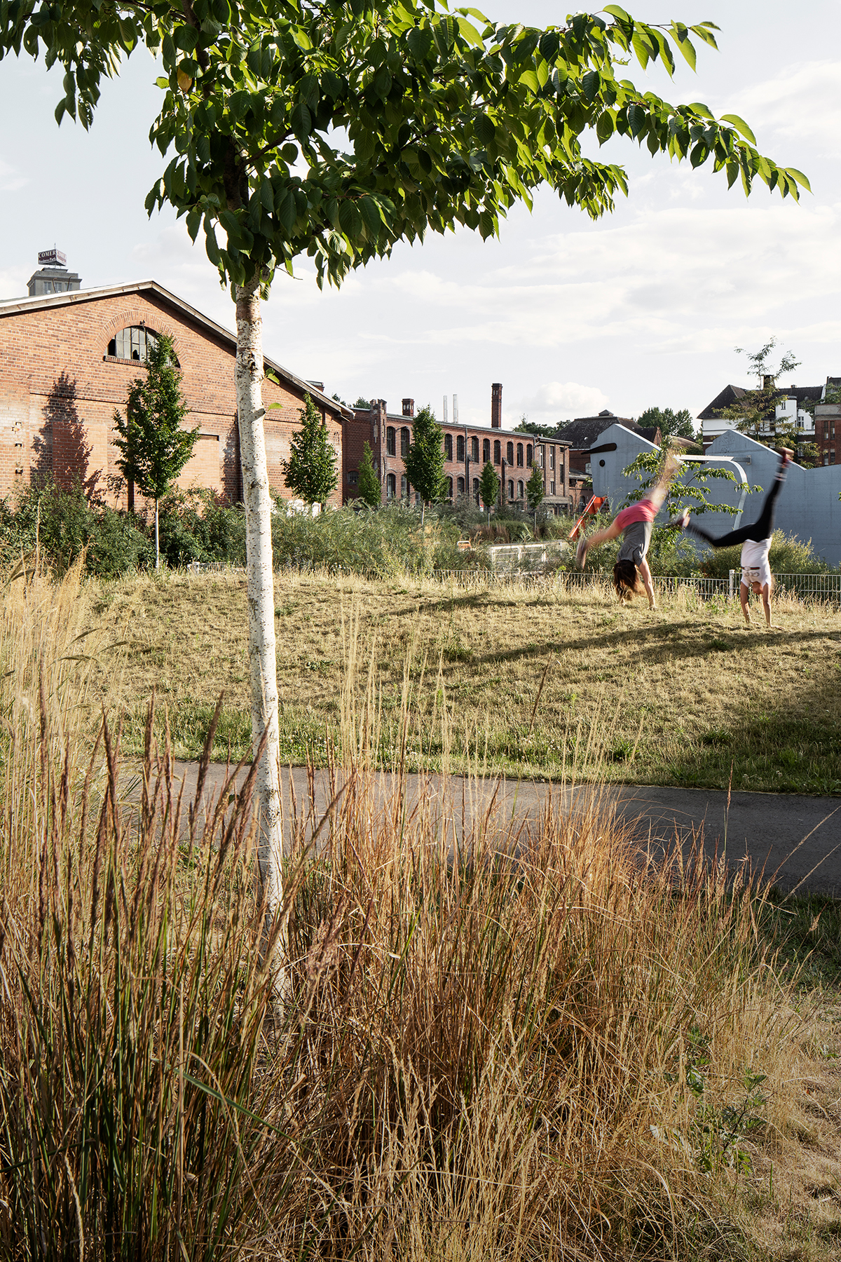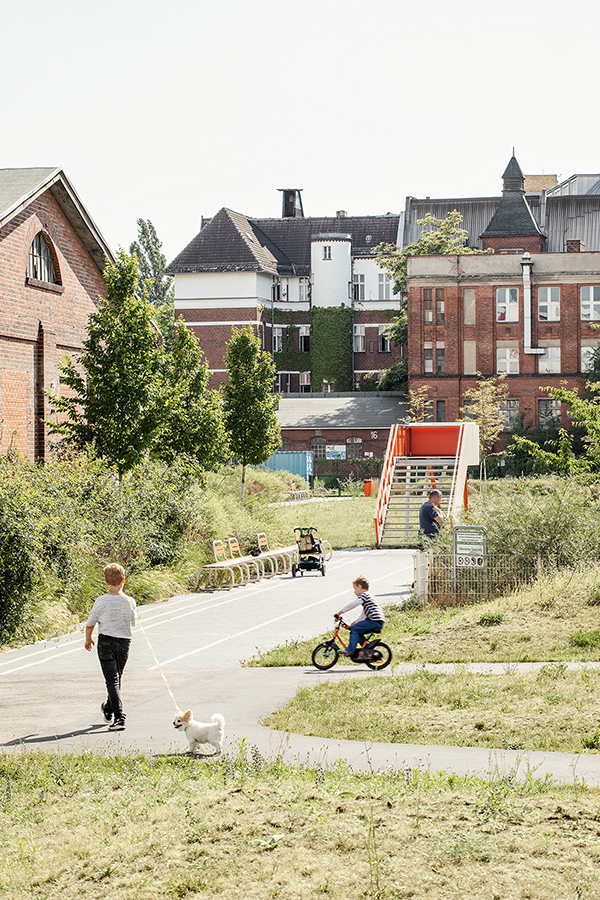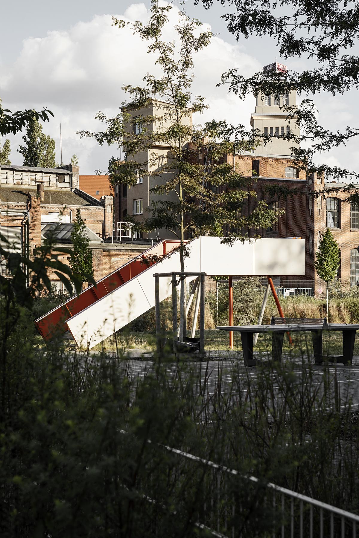 In der Wegeführung des Parks haben wir die klaren Gebäudegrundrisse des ehemaligen Industriewerkes aufgegriffen. So werden die Blicke bewusst auf die beeindruckenden Klinkerfassaden der angrenzenden Werksgebäude gelenkt. Auch die "Bullenbahn", im Volksmund Name der einstigen Industriebahn Oberschöneweide, darf in diesem Konzept der Spurensicherung nicht fehlen. Da die Elektrolokomotive "Blauer Bulle" ab Ende der 1970er-Jahre die Bahn zog, haben wir ein dementsprechendes "Zugtier" entworfen, das nun auf dem neuen Spielplatz steht. Mit seiner Kraft scheint der neue "Blaue Bulle" einen ganzen Stangenwald hinter sich her zu ziehen, der zum Klettern einlädt.