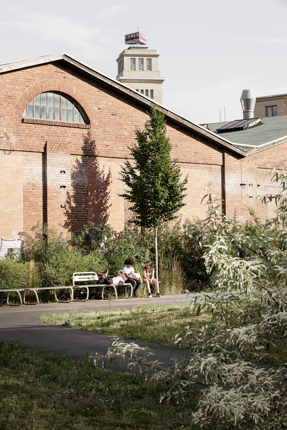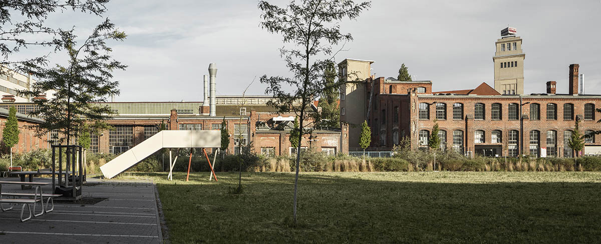Mit dem neuen Park bleibt die bemerkenswerte Industriegeschichte des Ortes im Bewusstsein. So haben wir in der Mitte des Geländes am früheren Standort des Schornsteins der Batteriefabrik eine Aussichtsplattform gebaut, den Panoramaturm. Von hier bietet sich ein Rundblick über die großartige Kulisse der denkmalgeschützten Industriearchitektur Berlin-Oberschöneweides. Auf Schautafeln können sich die Besucher über die Historie des Ortes informieren.