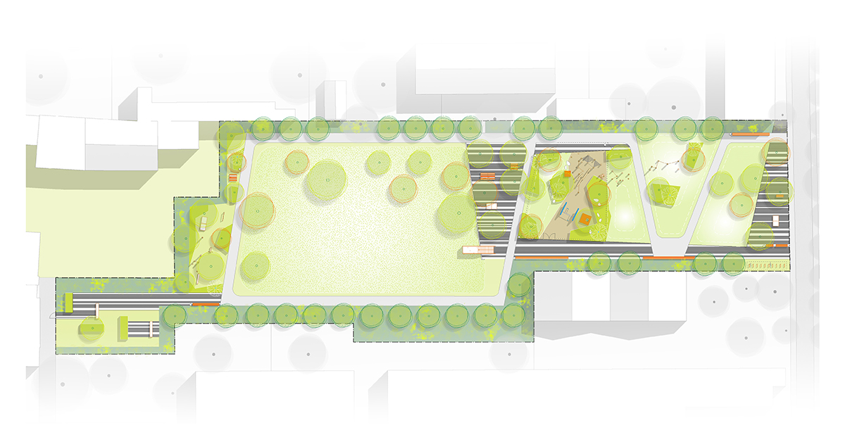 Das langgestreckte Grundstück haben wir in zwei unterschiedliche Bereiche gegliedert. Beide verbindet ein Rundweg, der als Jogging- und Walkingstrecke mit Trimmgeräten auch zum Fitnessparcours wird. Die im hinteren Bereich gelegene große Wiese gibt der Parkanlage Raum und Weite. Zudem findet sich hier eine Bürgerwiese im wahrsten Sinne des Wortes, etwa für Urban Gardening. Die dafür notwendigen Flächen können seitens des Bezirksamtes Vereinen oder anderen freien Gruppen zur Verfügung gestellt werden.