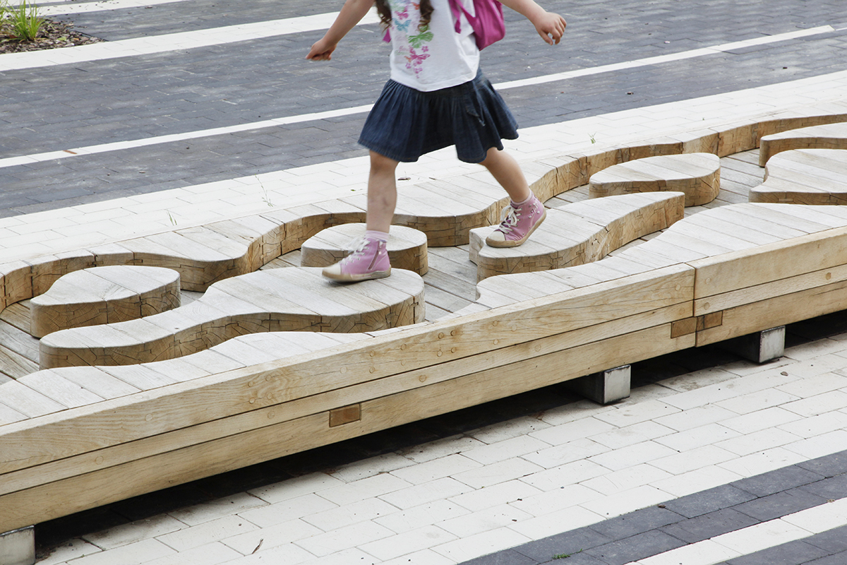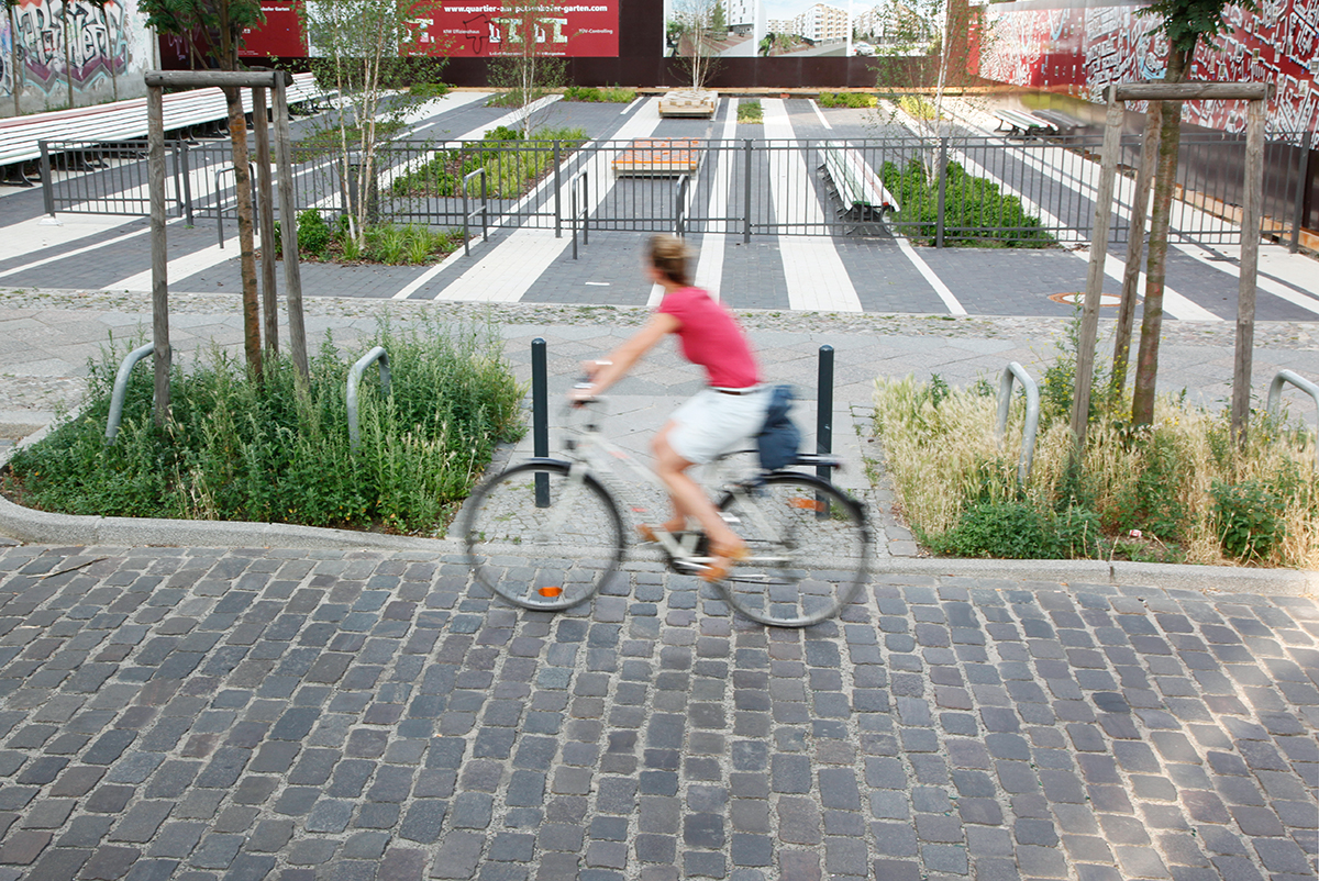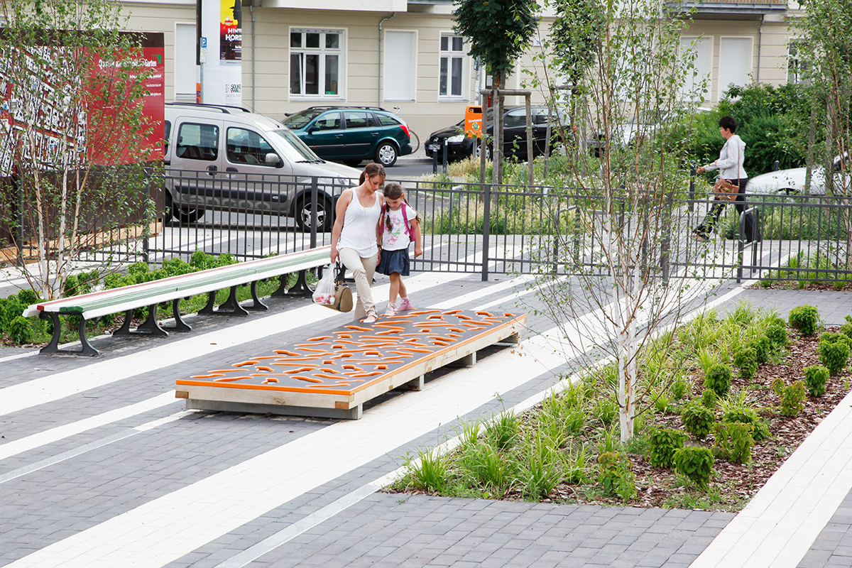 Durch die schwarz-weiß-gepflasterte Bänderung des Bodens haben wir eine Verbindung von der Straße in das Gelände gezogen und ihren öffentlichen Charakter betont. Im vorderen, aktiven Teil des Gartens ermöglichen Bewegungsangebote spielerisch verschiedene Betätigungsfelder. In die Streifengliederung haben wir schmale Beete eingeordnet, in denen Birken mit einer Unterpflanzung aus Gräsern und Stauden wachsen. Unterschiedliche Aktions- und Ruheangebote sind auf diese Weise kombinierbar. Auf der langgestreckten Südseite ragt die Terrasse eines Cafés in den Platz hinein. Den hinteren Teil, auf dem sich der historische Mühlenweg quer durch das Gelände zieht, haben wir primär als Garten für die Anwohner gestaltet.Barrierefreie Wege, altersgerechte Bänke und gute Beleuchtung machen den neuen Platz zu einem beliebten Aufenthaltsort.