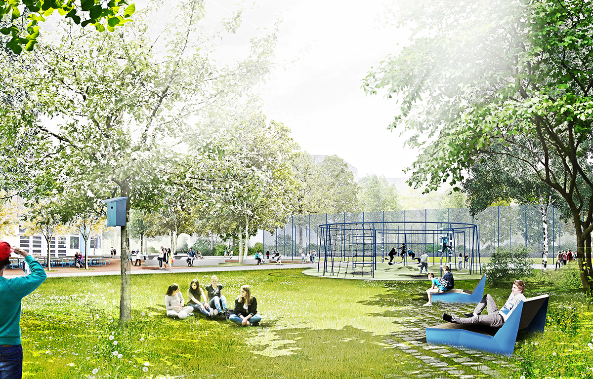 Laut dem Konzept des Senats werden viele Berliner Schulen in Gemeinschaftsschulen umgewandelt, die die Schüler von der ersten bis zur dreizehnten Klasse besuchen. Dementsprechend wurde in der Kreuzberger Carl-von-Ossietzky-Schule vor einigen Jahren eine Grundstufe mit den Klassen 1-6 eingeführt, zusätzlich zu den bereits bestehenden höheren Klassen 7–13. Diese Umstellung erfordert es, den 3 Hektar großen Schulcampus auch in den Außenräumen sinnvoll nach den Bedürfnissen der verschiedenen Altersgruppen aufzuteilen und neu auszustatten.