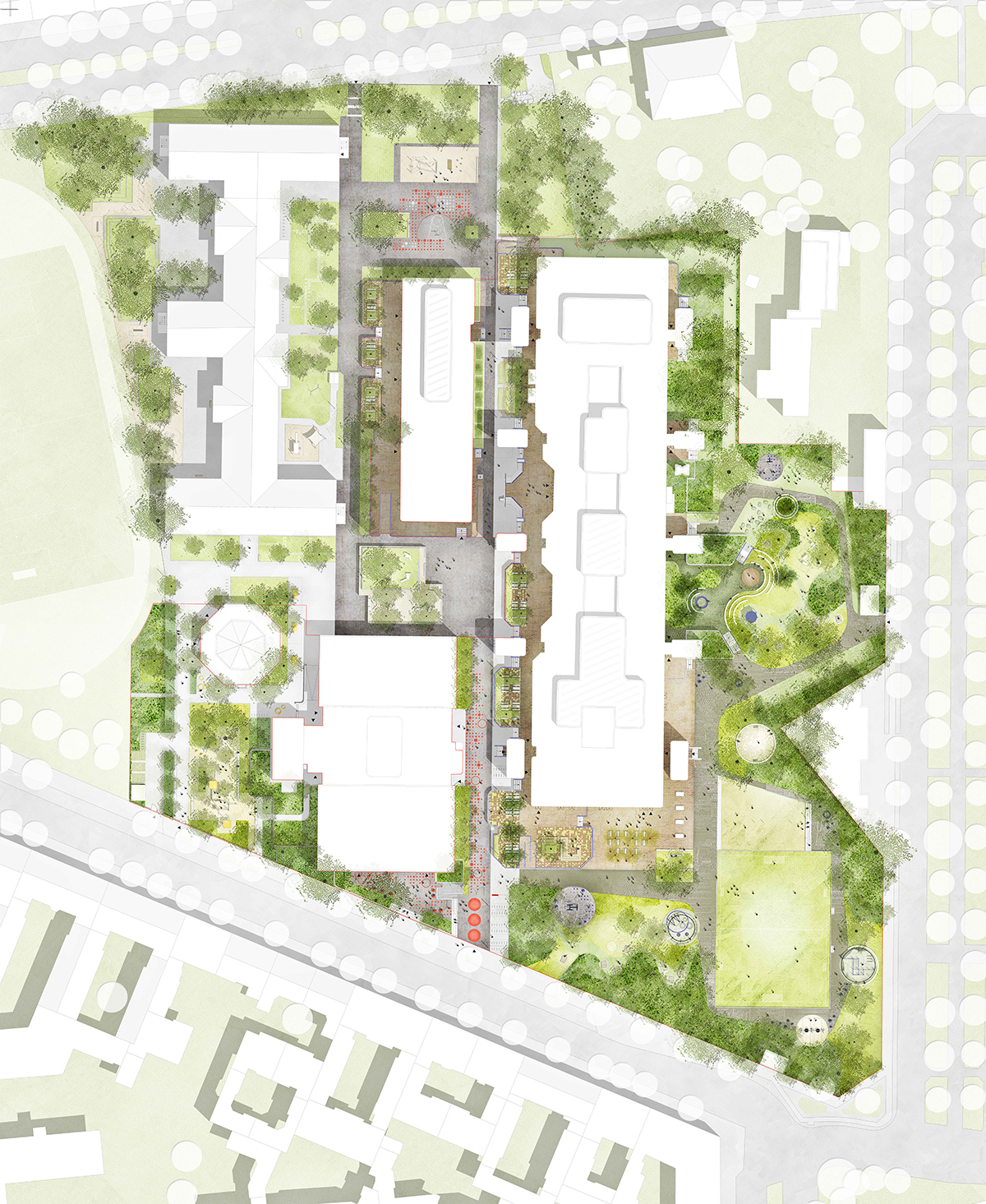 Das bislang sehr steinerne, von weiten Pflasterflächen geprägte Gelände wird auf der Basis des bisherigen Grundrisses weiterentwickelt und dabei angebotsreicher, ökologischer und freundlicher gestaltet. Zum Zweck der Einteilung in Bereiche für jüngere und ältere Schüler bedienen wir uns – der modernen Architektur angepasst – eines klaren Farbkonzepts auf der Basis der Grundfarben Blau, Gelb und Rot sowie der geometrischen Grundformen Kreis und Quadrat.Partizipation