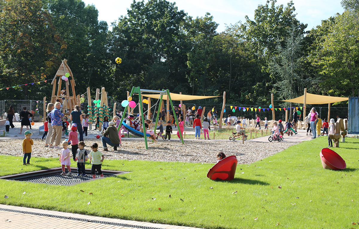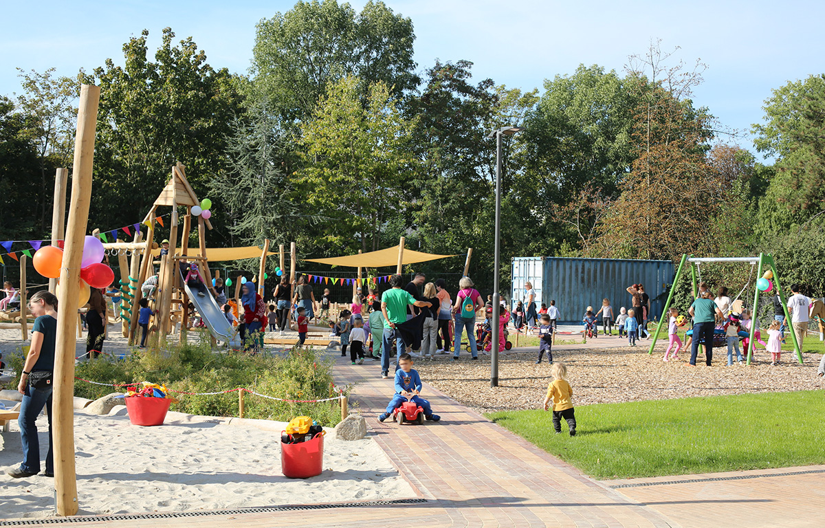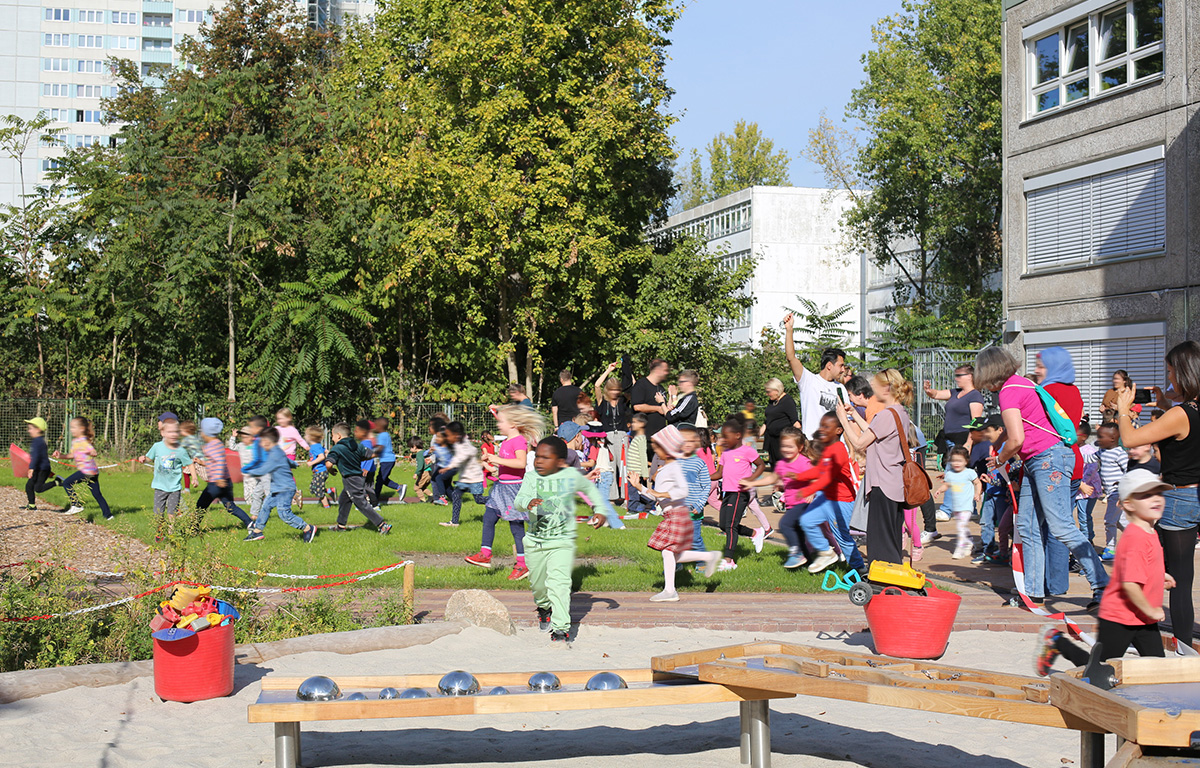 Die Kita Bewegungsreich wurde ab 2021 saniert, im Zuge dessen wurde ein innovatives Regenwasser-Bewirtschaftungskonzept mit extensiver Teil-Dachbegrünung, Abkopplung der Außenanlagen von der Kanalisation und Sammlung des Regenwassers in einer Zisterne umgesetzt. Letzteres wird zur Gartenbewässerung und zur Toilettenspülung im Bestandsbau genutzt. Im Herbst 2024 konnte der erste Teil der neugestalteten Außenanlagen in Besitz genommen werden.