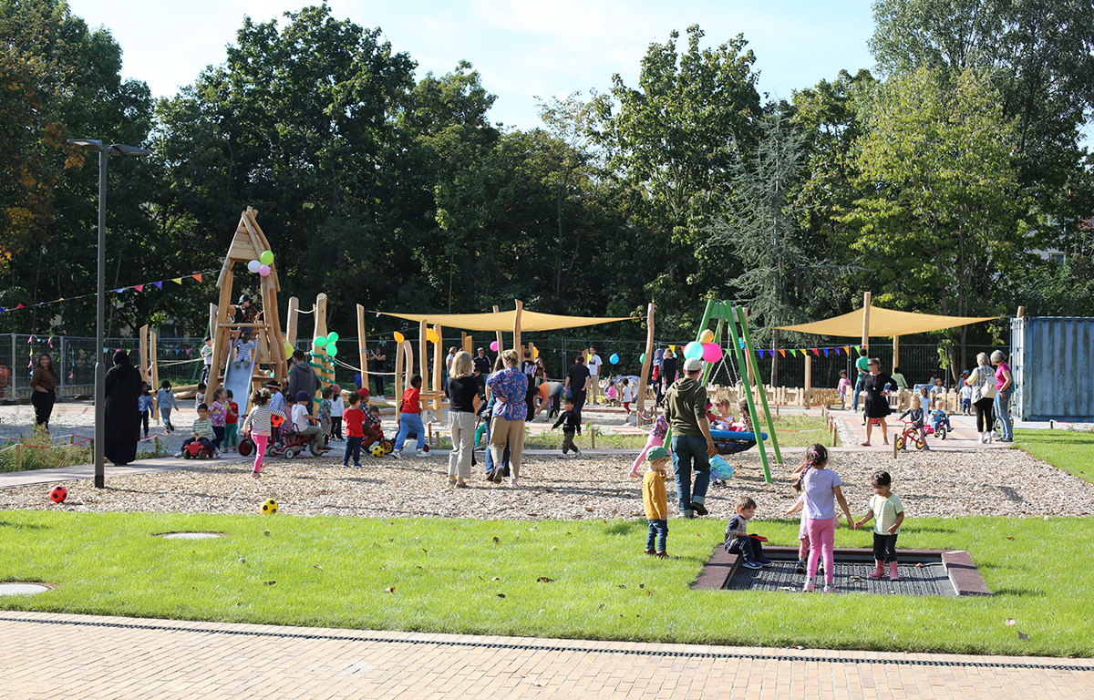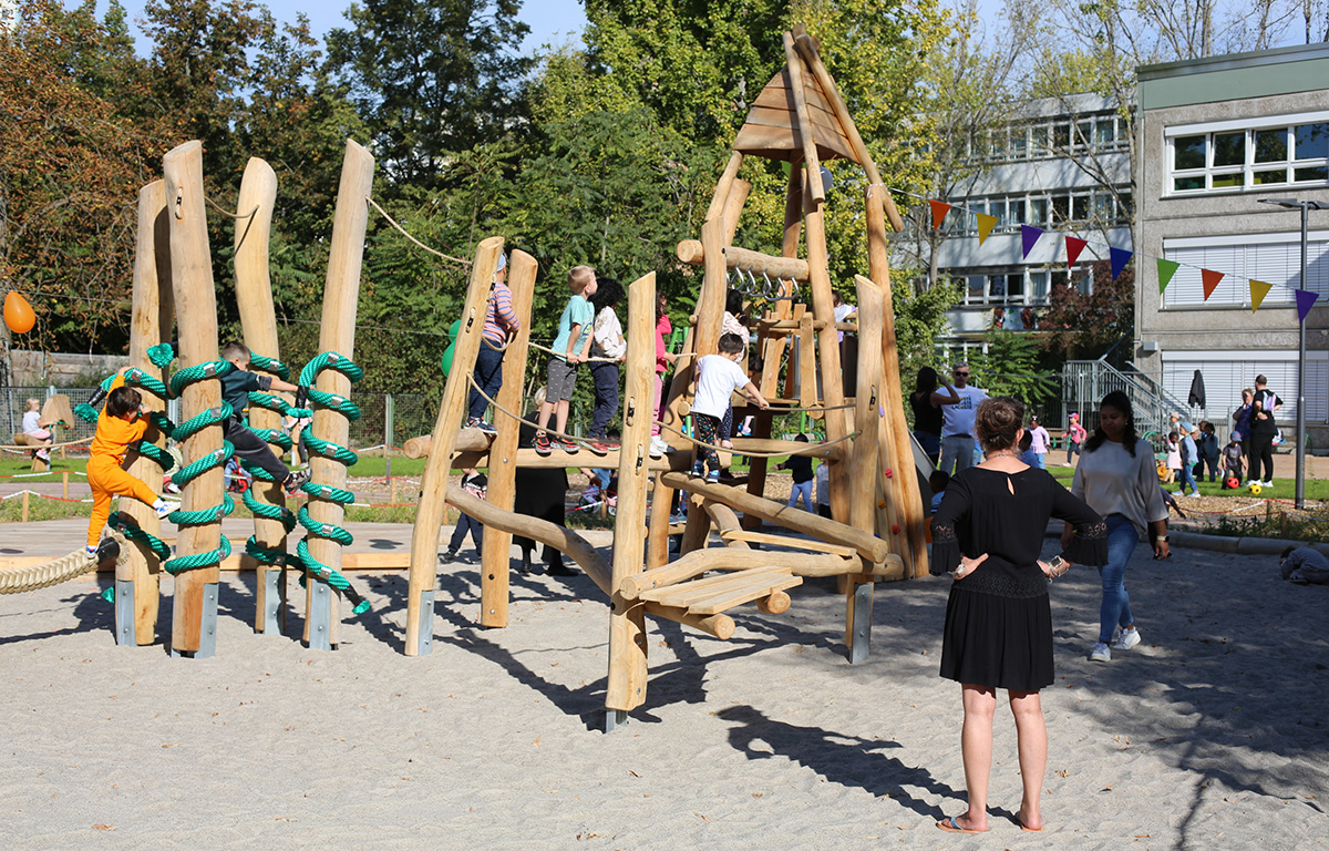 Im noch abgesperrten Teil werden eine Doppel-Schaukel, Tipis und ein kleinerer Kletterparcours sowie eine weitere Nestschaukel, eine Hängematte, eine Hütte und weitere Balancierhölzer das Angebot ergänzen. Die Spielgeräte bestehen überwiegend aus ungefärbtem Holz und Seilen. Holzdecks und Baumstämme dienen als Sitzmöglichkeiten und Abgrenzung der Sand- und Holzhäckselflächen.