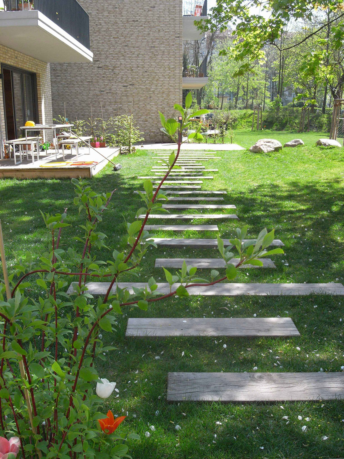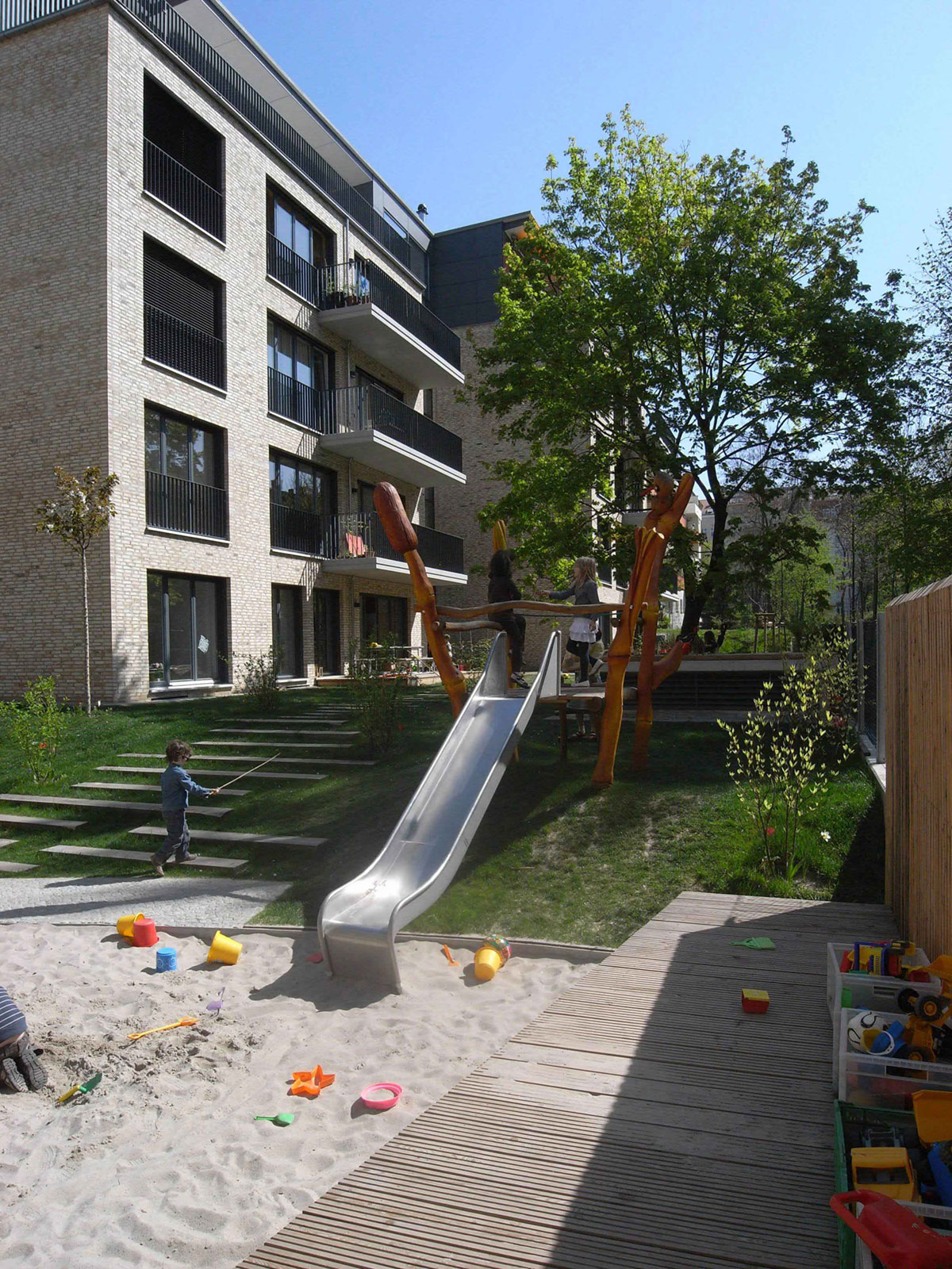 Die Gestaltung erforderte die Einbindung der ‚Infrastruktur’ (es wurden unter anderem 96 Fahrradstellplätze integriert) und der Nutzungsideen wie Gärtnern, Ballspiel, Party, Ruhe, Buddeln, Klettern in ein einheitliches, Binnenräume schaffendes Gestaltungskonzept. Idee des Entwurfs ist es einen ‚farbigen Teppich’ aus unterschiedlichen Räumen und Flächen zu “weben”, bunt und vielfältig, doch zugleich signifikant. Wege und Terrassen ziehen sich großzügig durch den Garten, verbinden die “grünen” raumbildenden Flächen, die zum Spiel und zur Erholung einladen.
