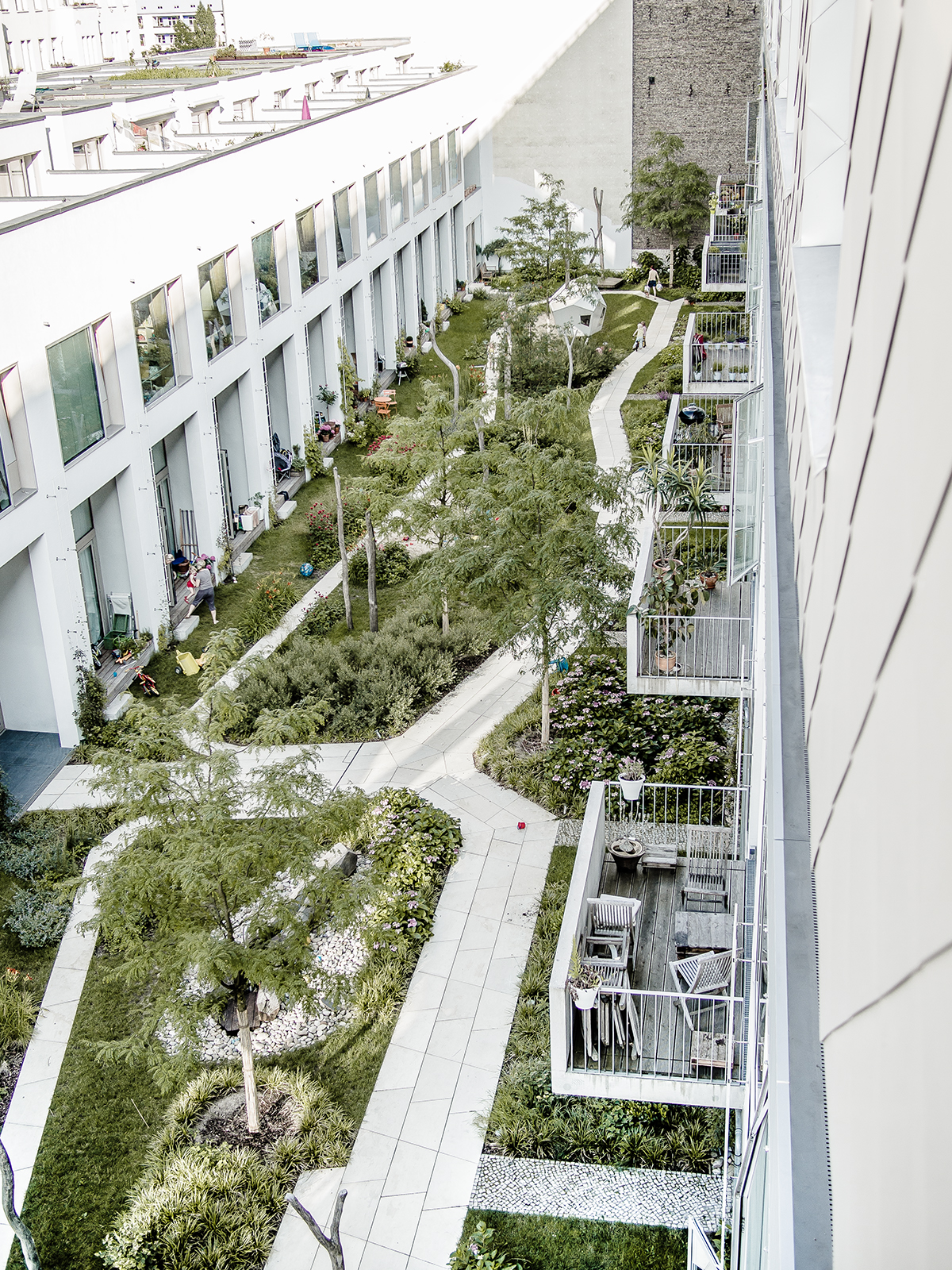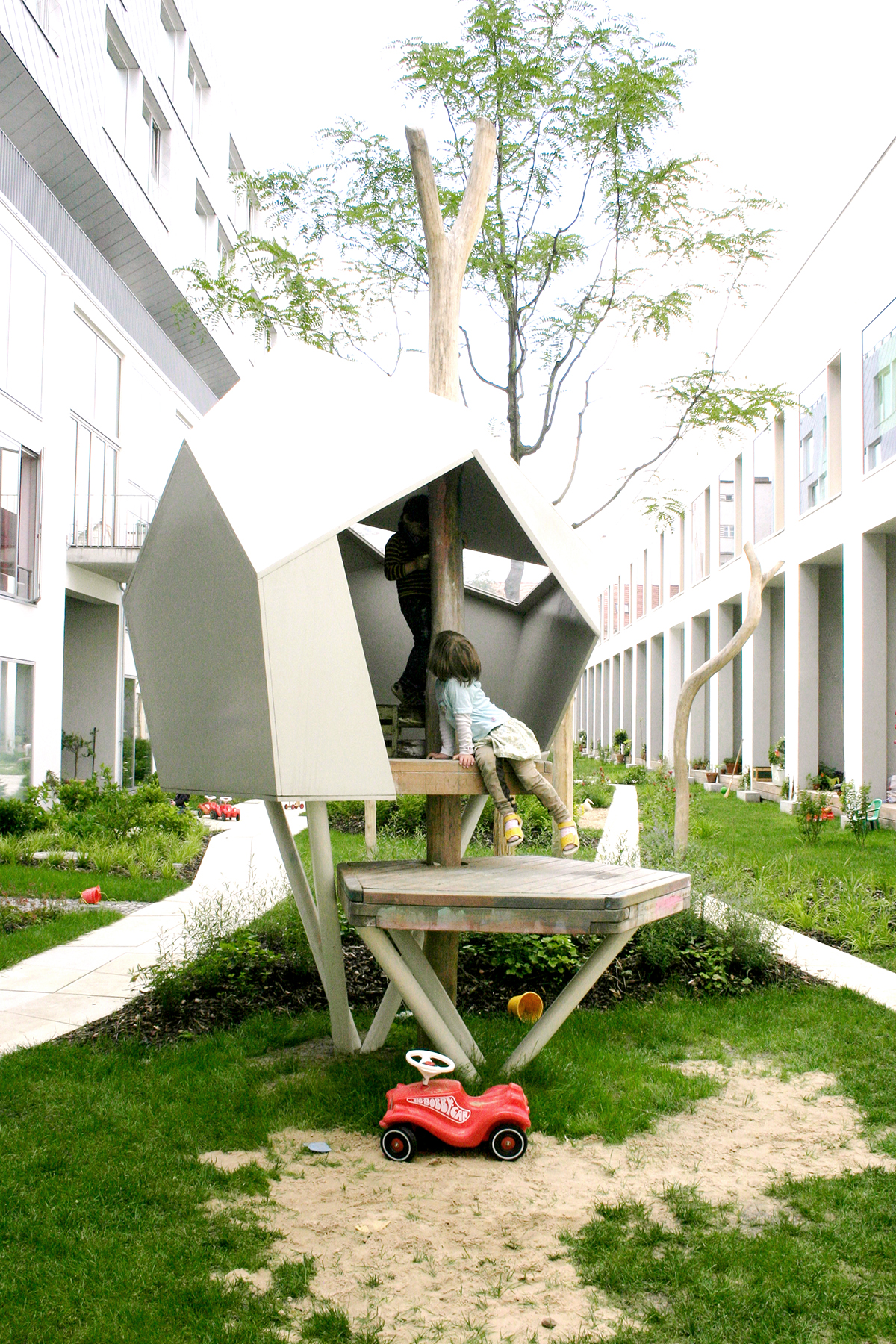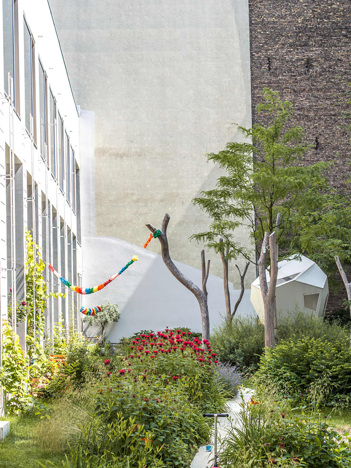 Die Grundstruktur wird von zwei schleifenförmigen Rundwegen gebildet, die zum unendlichen Bobby-Car-Fahren einladen. Von hier aus führen Erschließungswege zu den Eingängen der rückwärtigen Townhouses. Die Breite der Rundwege aus großformatigen Sichtbetonplatten ist auf das notwendige Minimum beschränkt. Die Trapezform der Zugangswege und die Oberflächenausführungen – rutschhemmend in den Erschließungs-, geräuscharm in den Rundwegen – wurden eigens von uns entwickelt. Hügel und Pflanzungen schaffen im Hof kleinteilige Räume mit unterschiedlichen Nutzungsangeboten. Sie sind gleichmäßig über die Kleinräume verteilt, reduzieren Konfliktpotentiale und bieten Rückzugsnischen an. Um den Gartencharakter zu betonen, haben wir Gräser und Stauden angepflanzt und darüber mit Bäumen wie Eberesche und Gleditschie einen lockeren Filter gebildet. Räumliche Akzente haben wir mit Flieder, Hortensien und Magnolien gesetzt. Unser Konzept des Wohnhofs wird durch Baumstämme, Holzpodeste, einen Brunnentrog und sogar ein Baumhaus mit Leben erfüllt. All diese Angebote können von Kindern und Erwachsenen gleichermaßen benutzt werden.