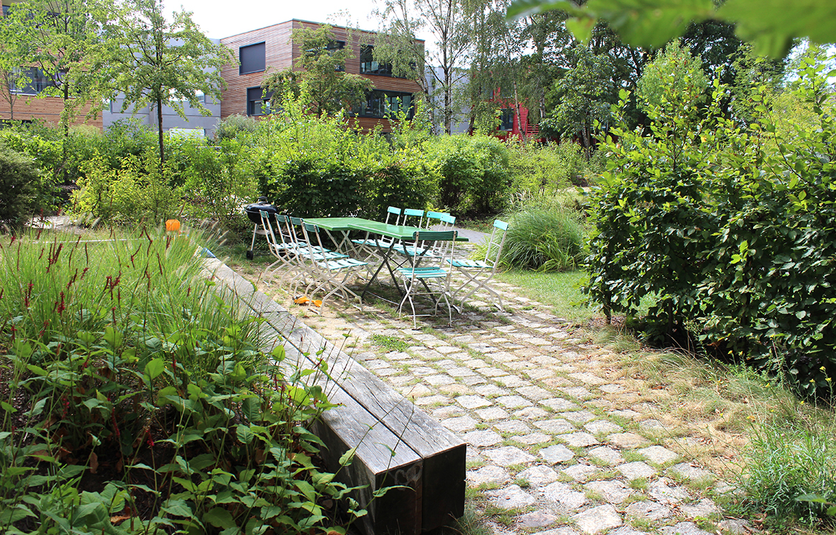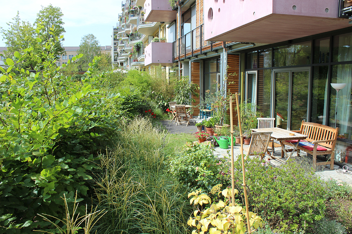 Die Gestaltung verbindet die eigentlich aus drei Einzelgärten bestehende Anlage zu einem zusammenhängenden Garten. Dies entspr icht dem Selbstverständnis der drei Baugruppenhäuser als gemeinschaftliches Bau- und Wohnprojekt. Die Einbindung der ‚Infrastruktur’ aus selbstbetreutem Nutzgarten im Sinne des „Urban Gardening“, wohnungsnahen Terrassenbereichen vor den Erdgeschossw ohnungen sowie gemeinschaftlich genutzten Rasenflächen und Sitzbereichen war ein weiterer Anspruch der Baugruppe an die Planung.Die verschiedenen Nutzungsideen wie Gärtnern, Ballspielen, Buddeln, Klettern, aber auch Party und Erholung haben wir in ein einheitliches, Binnenräume schaffendes Gestaltungskonzept integriert.